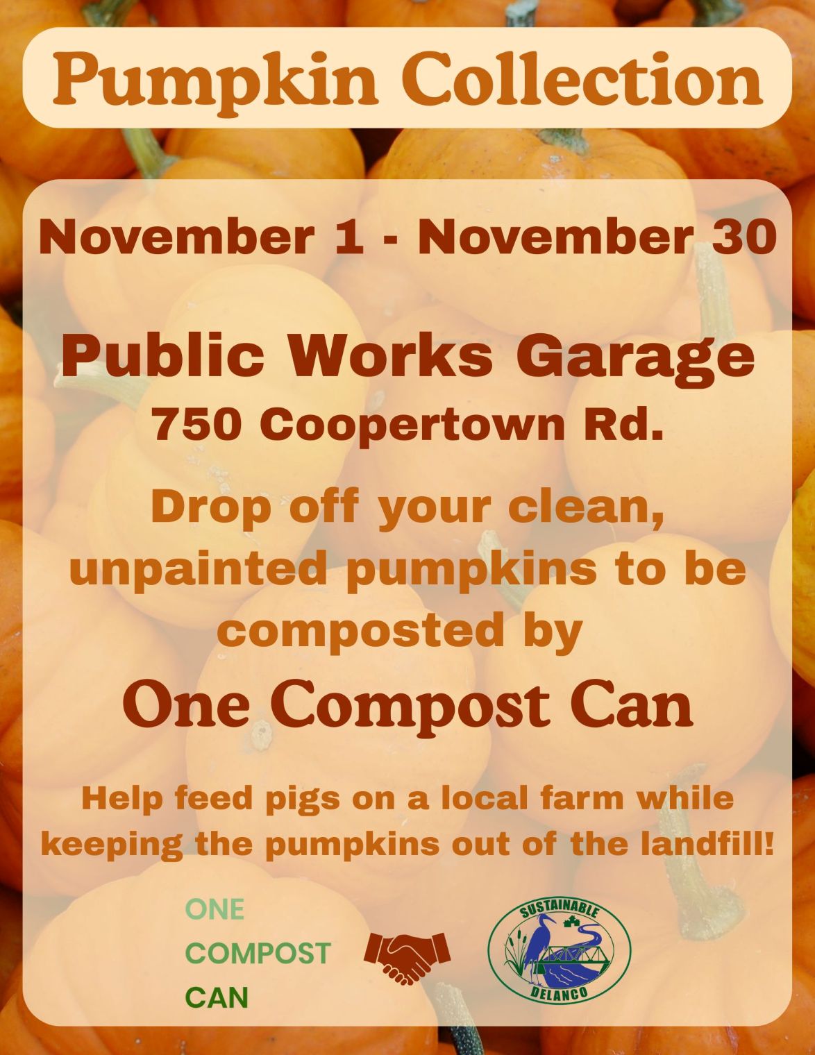 The Environmental Advisory Board has partnered with One Compost Can, a local farmer who provides food composting services to residents and businesses, to hold a pumpkin composting collection throughout the month of November.