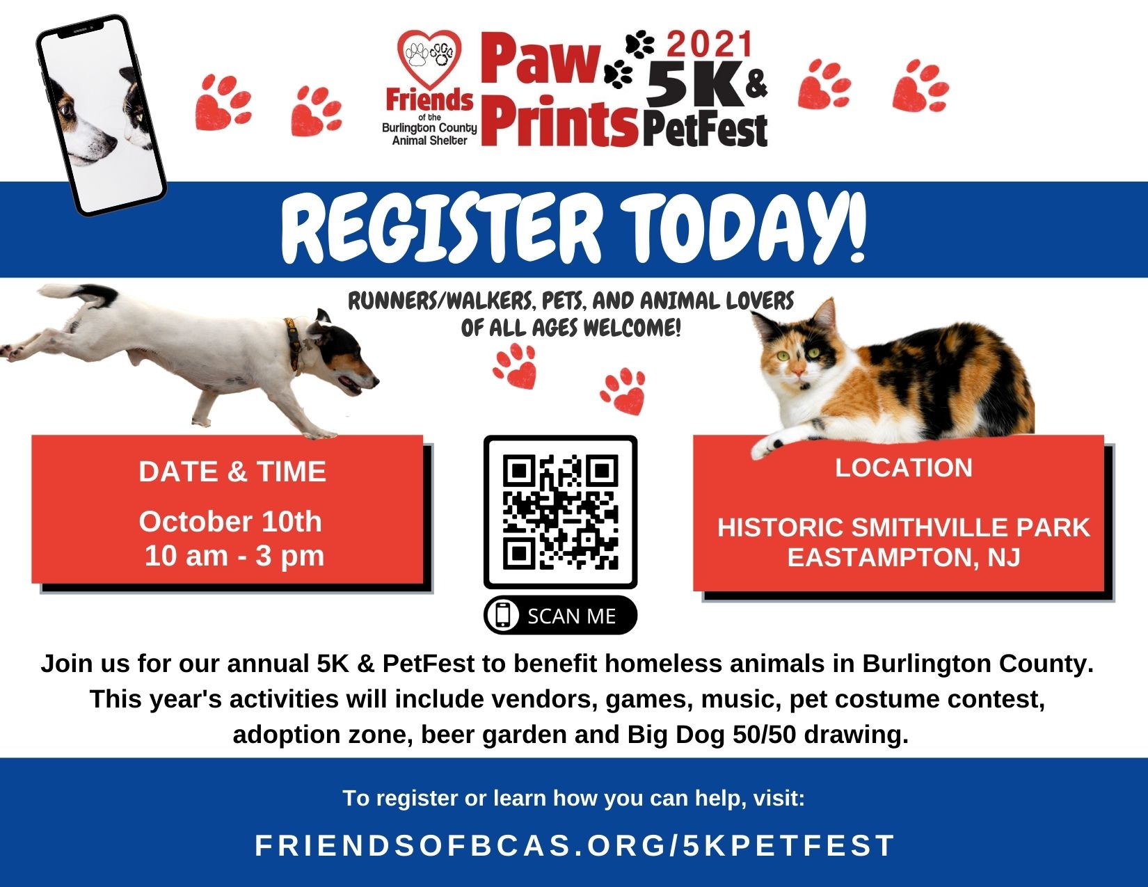 Please see the links below for information for the Friends of Burlington County Animal Shelter, Paw Prints 2021 5K/Pet Festival and First Responder Challenge on October 10th at Historic Smithville Park, Eastampton, NJ from 10am-3pm.