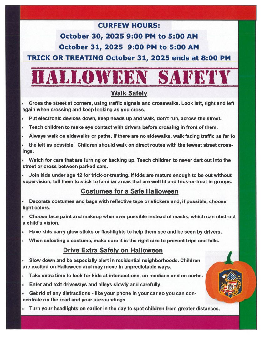 Pursuant to Chapter 154-3 of the Delanco Township Code, please be advised that there is a 9:00PM curfew on Thursday, October 30th and Friday, October 31st; Trick-or-Treating will end at 8:00PM on Friday, October 31st. Have a Happy & Safe Halloween!