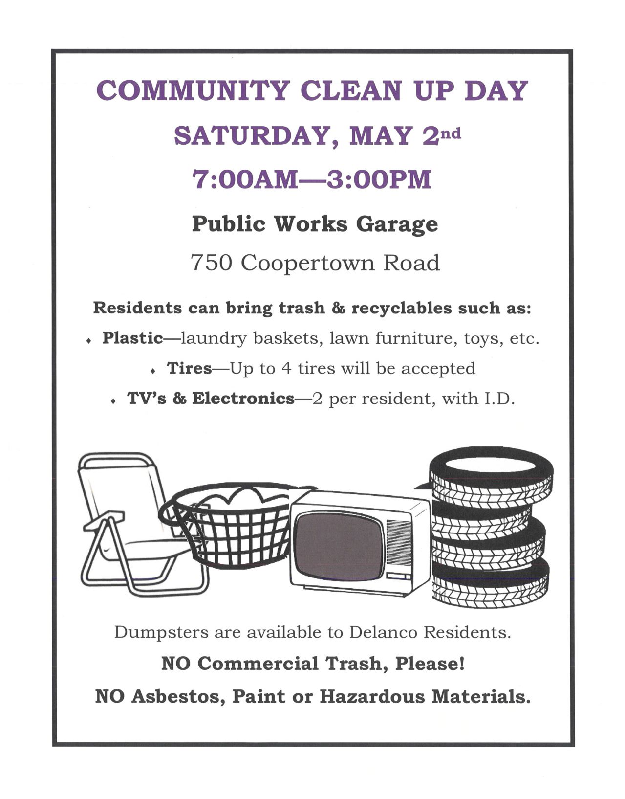 Delanco Community Clean Up Day--Saturday, May 2nd at the Public Works Garage, 750 Coopertown Road, Delanco, from 7:00AM to 3:00PM.