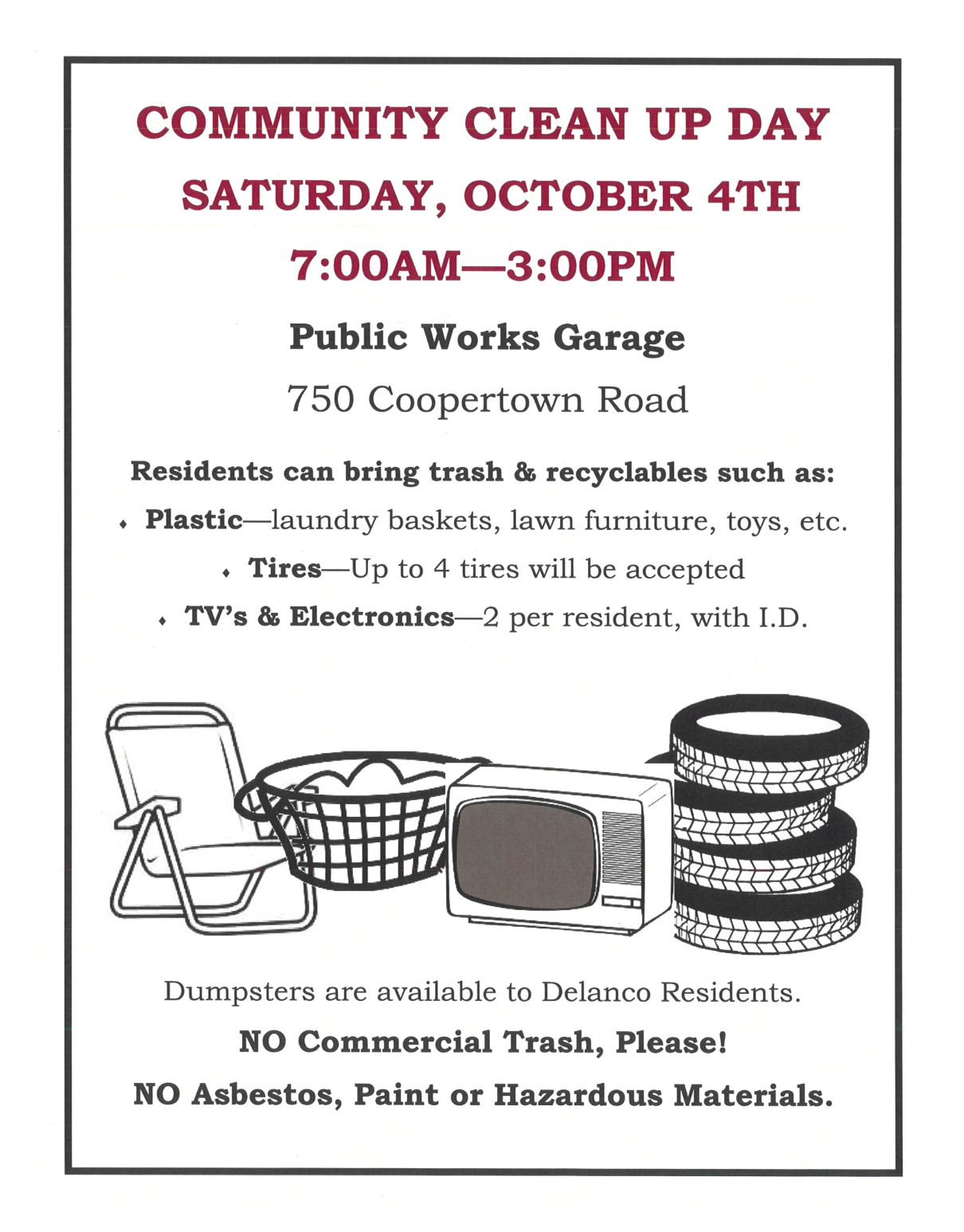 Delanco Community Clean Up Day--Saturday, October 4th at the Public Works Garage, 750 Coopertown Road, Delanco, from 7:00AM to 3:00PM.