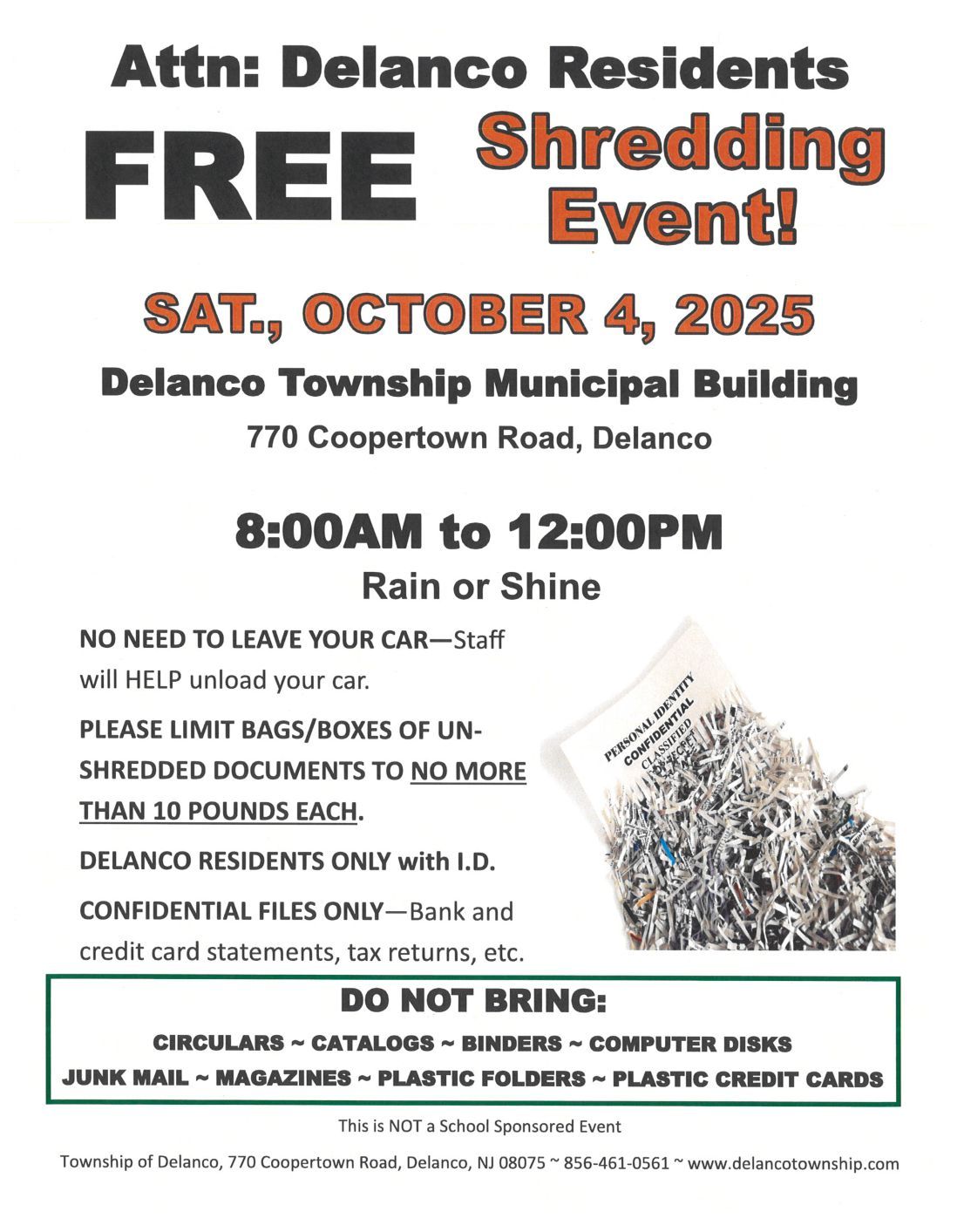 Delanco Township will hold a Free Shredding Event for Delanco Residents on Saturday, October 4th, in the Municipal Building front parking lot, (770 Coopertown Road, Delanco), from 8:00AM to 12:00PM. This event is rain or shine.