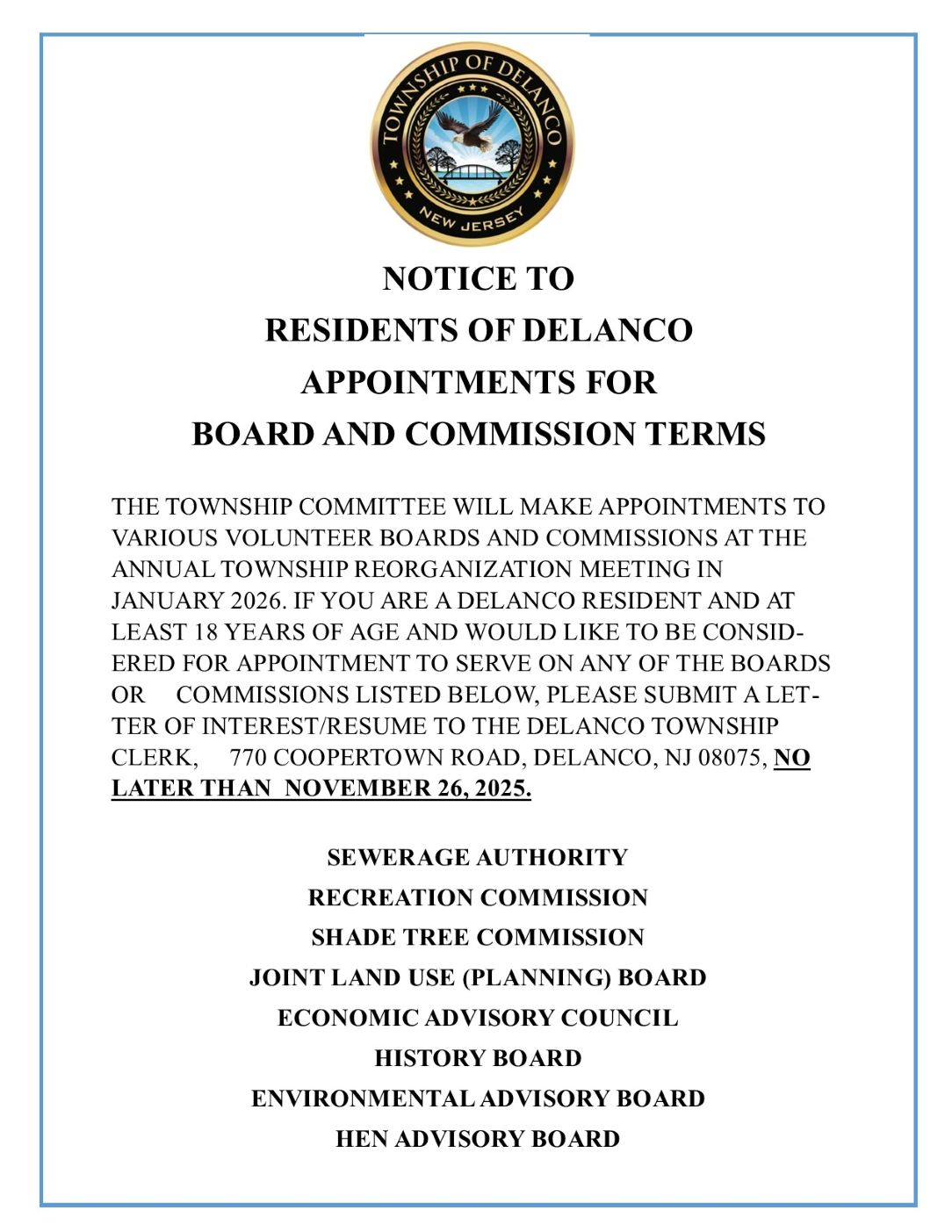 The Township Committee will make appointments to various volunteer boards and commissions at the annual Township Reorganization Meeting in January 2026.
